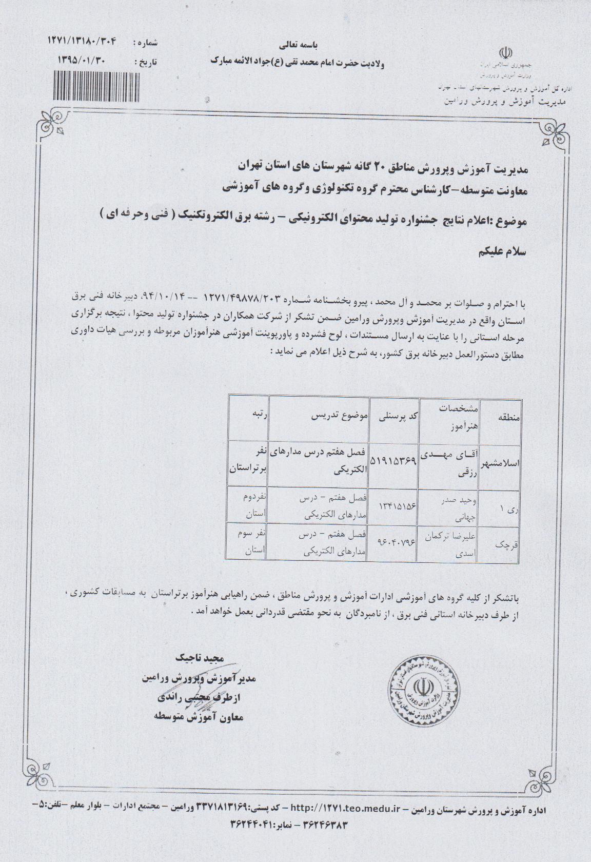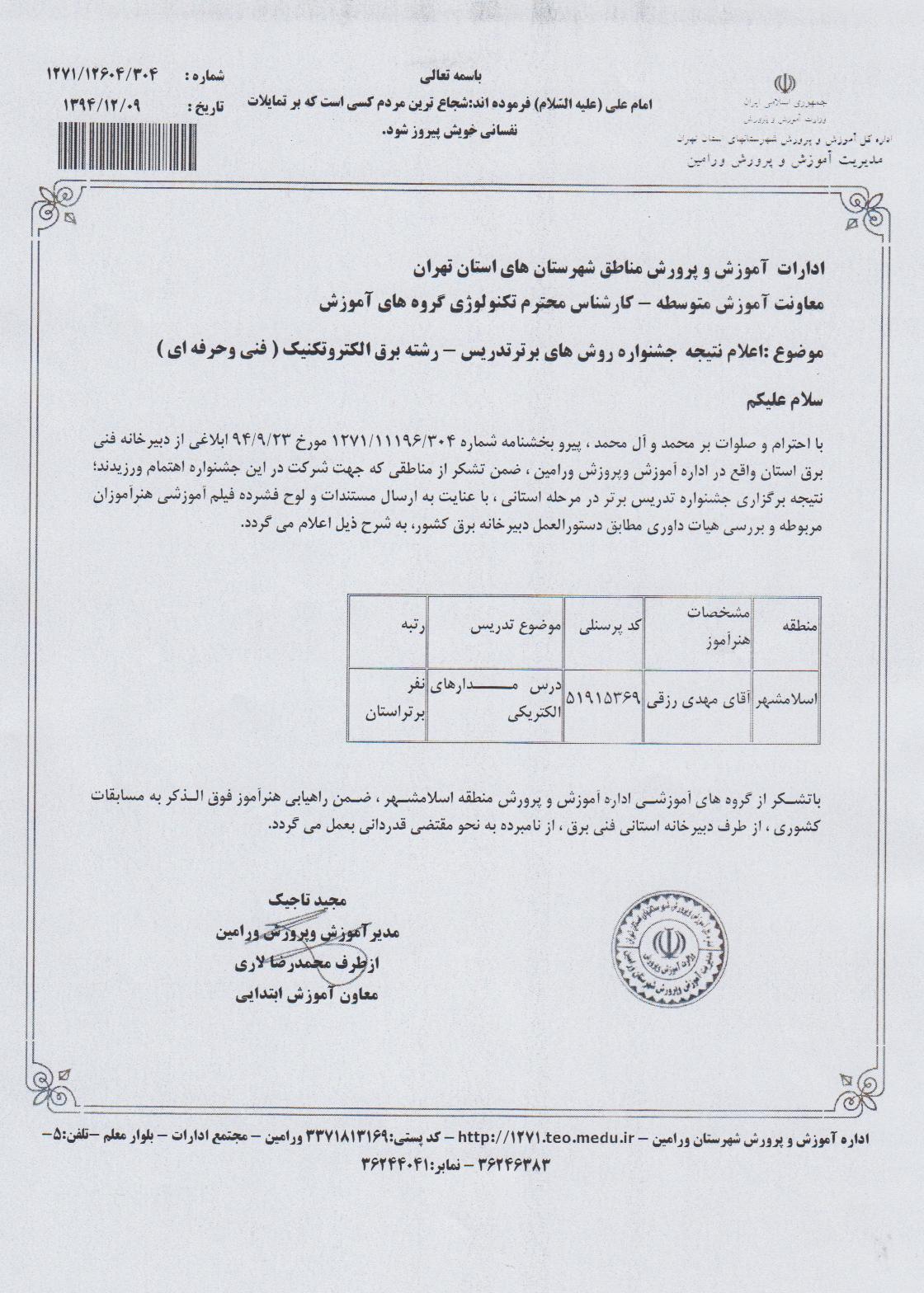 *محتواری الکترونیکی تهیه شده توسط هنراموز برتر هر منطقه در قالب لوح فشرده و فایل پاورپوینت به دبیرخانه استانی برق واقع در گروههای آموزشی اداره آموزش پرورش ورامین ارسال گردد.